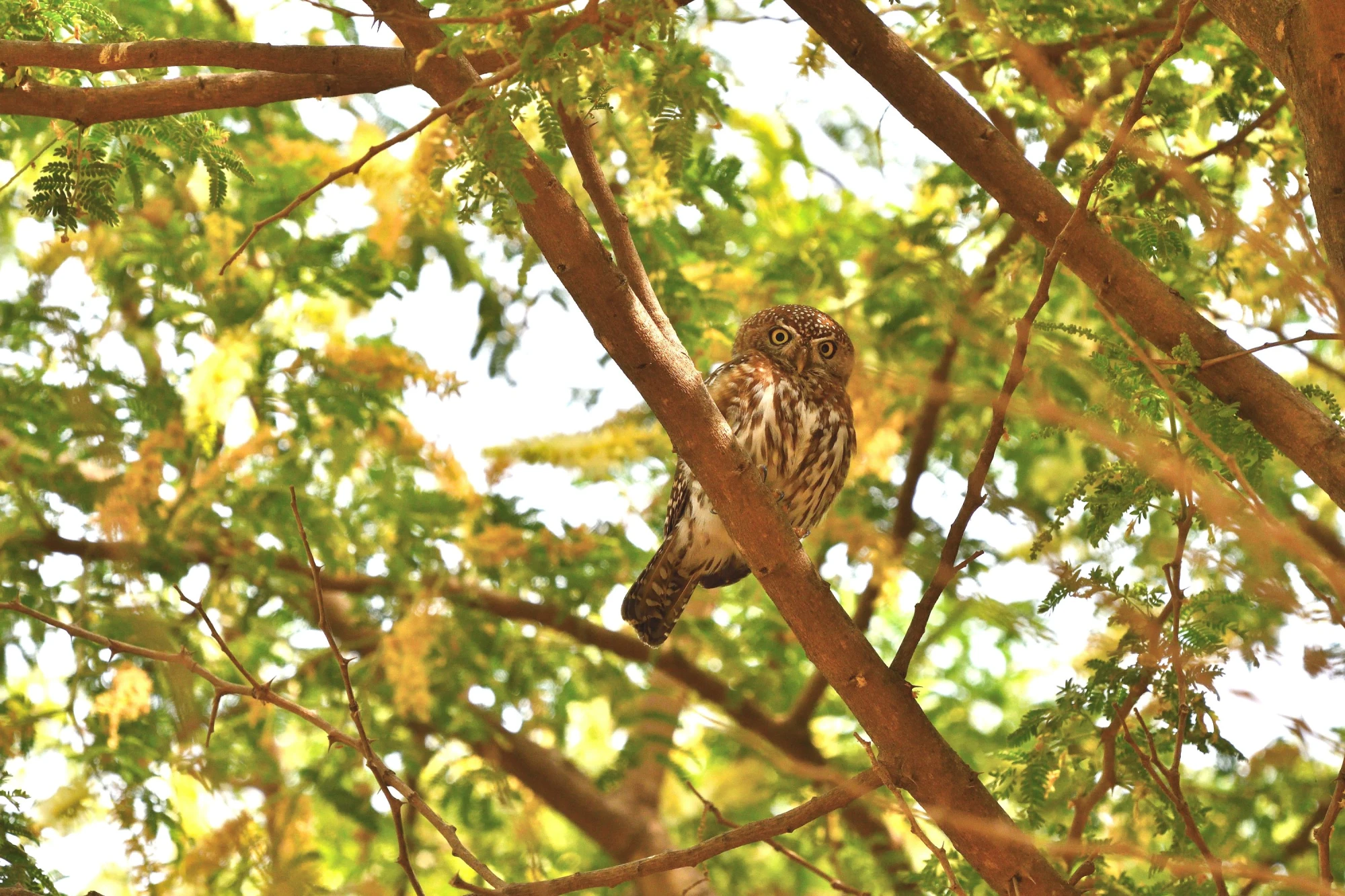 Western Grey Plantain-eater, Pearl-spotted Owlet, Fork-tailed Drongo